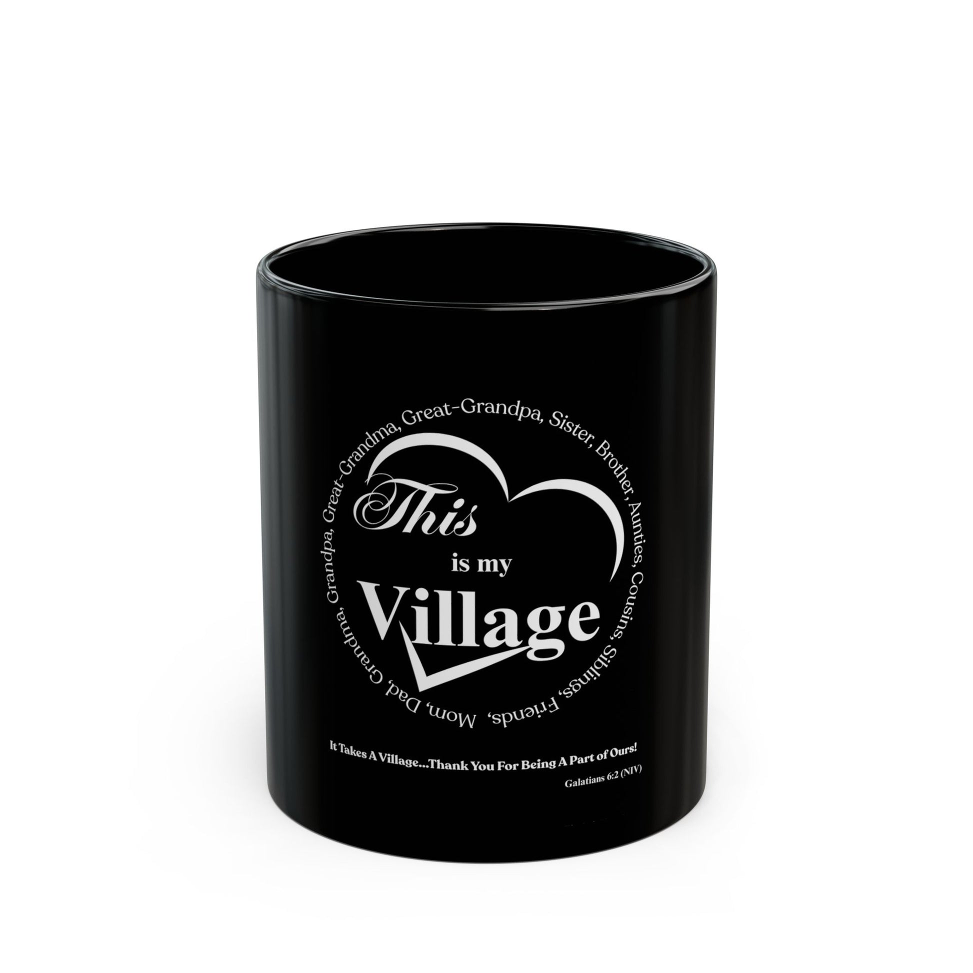Black ceramic mug with a glossy finish and bold white artwork that reads “This is my Village” framed inside a heart. It feels calm and personal — like a quiet nod to the people who shape your life. The rich black surface makes the white design pop, giving every sip a little moment of warmth and connection. Durable and everyday-ready, it works on slow morning routines, late-night desk sessions, or when you want to hold something that reminds you of community and belonging.